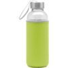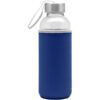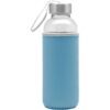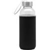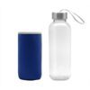 Medidas: Ø 5,5 x 19,5 cm. Capacidad 440 ml. Vidrio. Cuerpo traslúcido. Contiene funda de neopreno que permite no calentar la bebida con las manos. Tapa de acero inoxidable con tira de tela. Impresión Serigráfica a un color.