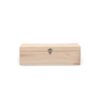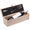 Set de vino de cuatro elementos en caja de madera. Contiene: Sacacorchos de dos tiempos, Navaja, Destapador corona, Corta gota, Tapón. Corta cápsulas. Accesorios de acero inoxidable. Cuna de caucho color Negro. Caja de madera natural. Packaging Cartón. Medidas de caja: 36.5 x 11 x 11 cm.