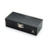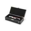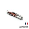 Destapador de diseño francés de acero forjado 420 y mango de madera noble con detalles metálicos. Posee tres funciones: Sacacorchos de dos tiempos, navaja y destapador corona. Packaging: caja de madera negra con cuna, cierre y bisagras metálicas de color plata. Asimismo, incluye otra caja contenedora de cartón laminada para su protección. Medidas: 16 x 7 x 4 cm. Laguiole.
