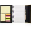 18 x 13.5 x 1 cm. Cuaderno de cartón con espiral. Dos autoadhesivos rectangulares (grande y mediano), cinco autoadhesivos señaladores de diferente color y bolígrafo. 70 hojas rayadas.Cierre imantado.
