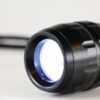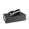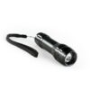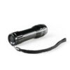 Linterna Led de aluminio de 3 posiciones: intenso, tenue e intermitente. Con botón pulsador ergonómico de goma. Posee punta con regulador de intensidad. Correa sujetadora. Medidas: 11 cm x 3 cm.