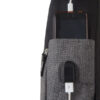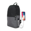 Mochila con puerto USB y compartimiento Principal Portanotebook, Realizada en Polyester 600D + Polycanvas. Cuenta con bolsillo Frontal con cierre y bolsillos laterales. Medidas: 44 x 12 x 27 cm.; Capacidad: 14 Lts; Laptop: 15ยด.
