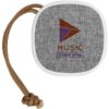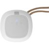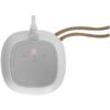 Medida: 9 x 9 x 4,4. Plástico. Parlante/bocina bluetooth cubierto en tela. En la parte inferior engomado antideslizante con botones para encender o apagar, play/pausa y responder llamadas. Botón de retroceso y avance, este último, si se mantiene presionado durante unos segundos pasa al siguiente sonido, estos mismos botones permiten aumentar o disminuir el volumen. Entrada USB incluye cable. Lazo de tela color marrón que permite colgarlo. Duración de la batería 8 – 12 hs aprox.