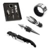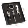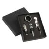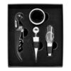 Caja de Negra de Carton Rigido con set 4 piezas para vino. La Parte superior de la caja es transparente. El Set de Vino incluye Destapador, Anillo Antigoteo, Tapón dosificador y tapon.