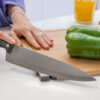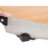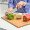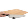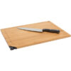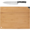 Medidas: 40 x 30 x 1.2 cm. Bambú. Set de corte. Tabla de Bambú con afilador incorporado y cuchillo. Cuchillo de acero inoxidable con mango en madera color negro de 32.5 cm . Afilador de plástico y acero de 5 x 2,4 x 1,2 cm. Presentación en caja de regalo